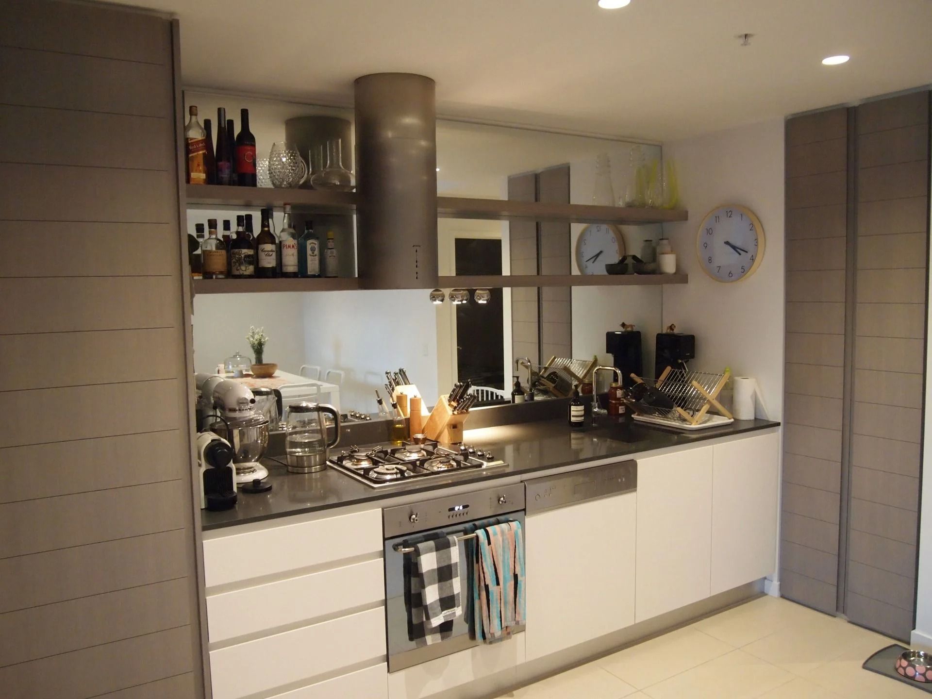 – Sleek kitchen with stone bench-tops, stainless steel Smeg gas stove top and electric oven, plus fridge