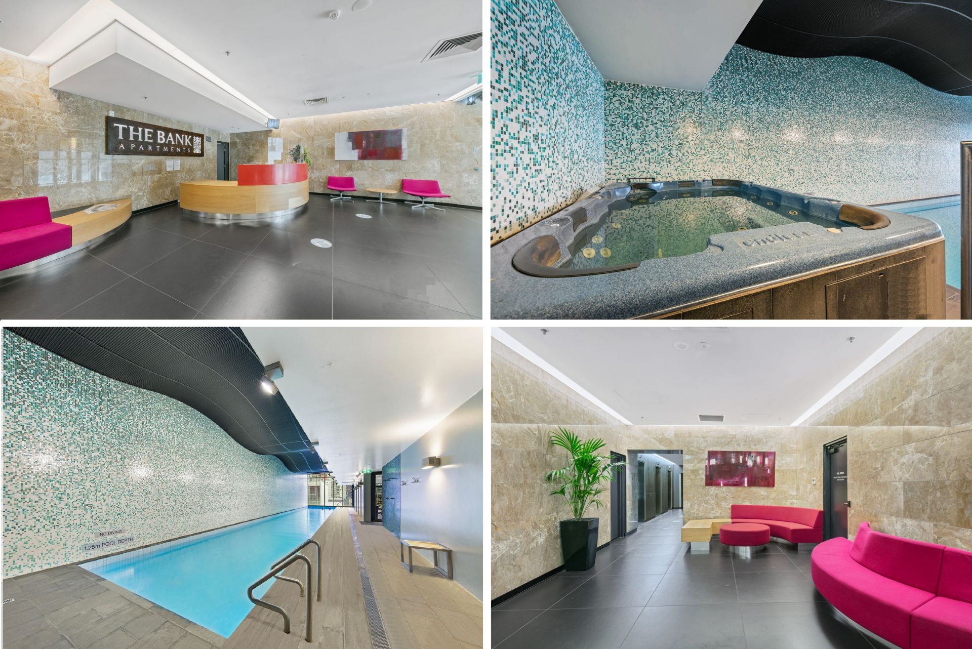 Building amenities include: 25-meter pool, spa, sauna, fully equipped gym and a separate cardio room.