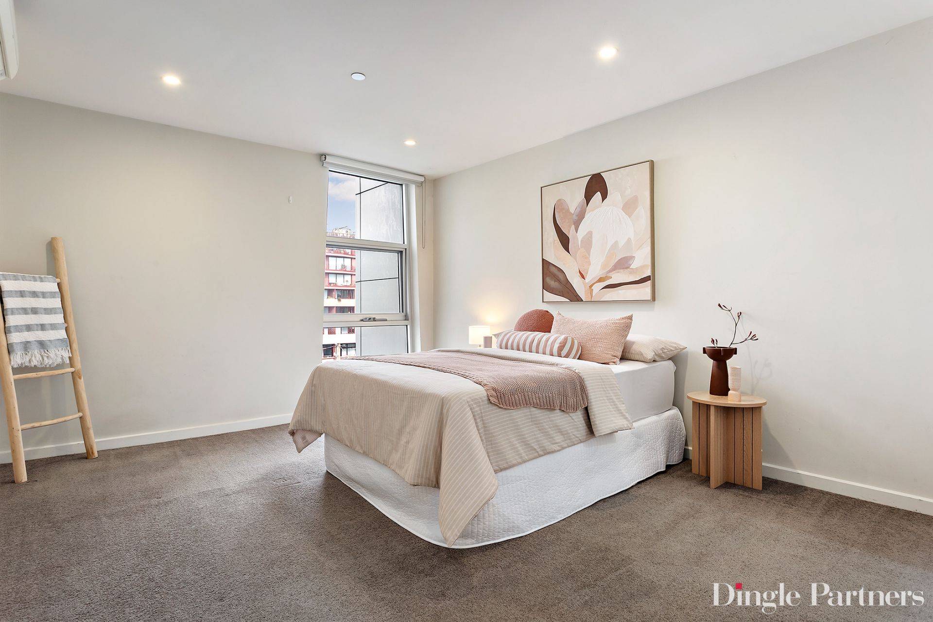 The generous bedroom includes a fitted walk-in wardrobe and connects to a contemporary two-way bathroom, which is beautifully appointed with a stone-topped vanity and floor-to-ceiling tiles.