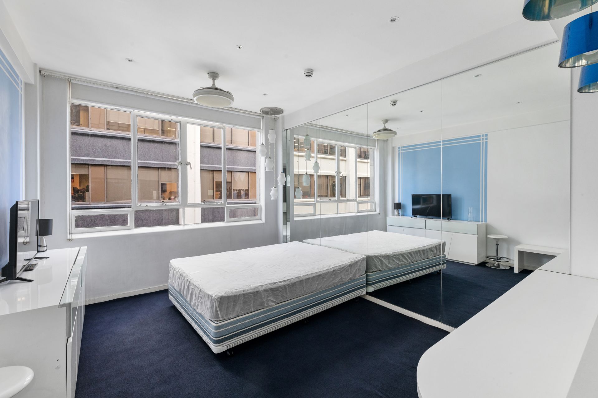This compact space is visually enhanced by the clever use of mirrors and combined with its high ceilings and wall of windows creates an impression of spaciousness.
