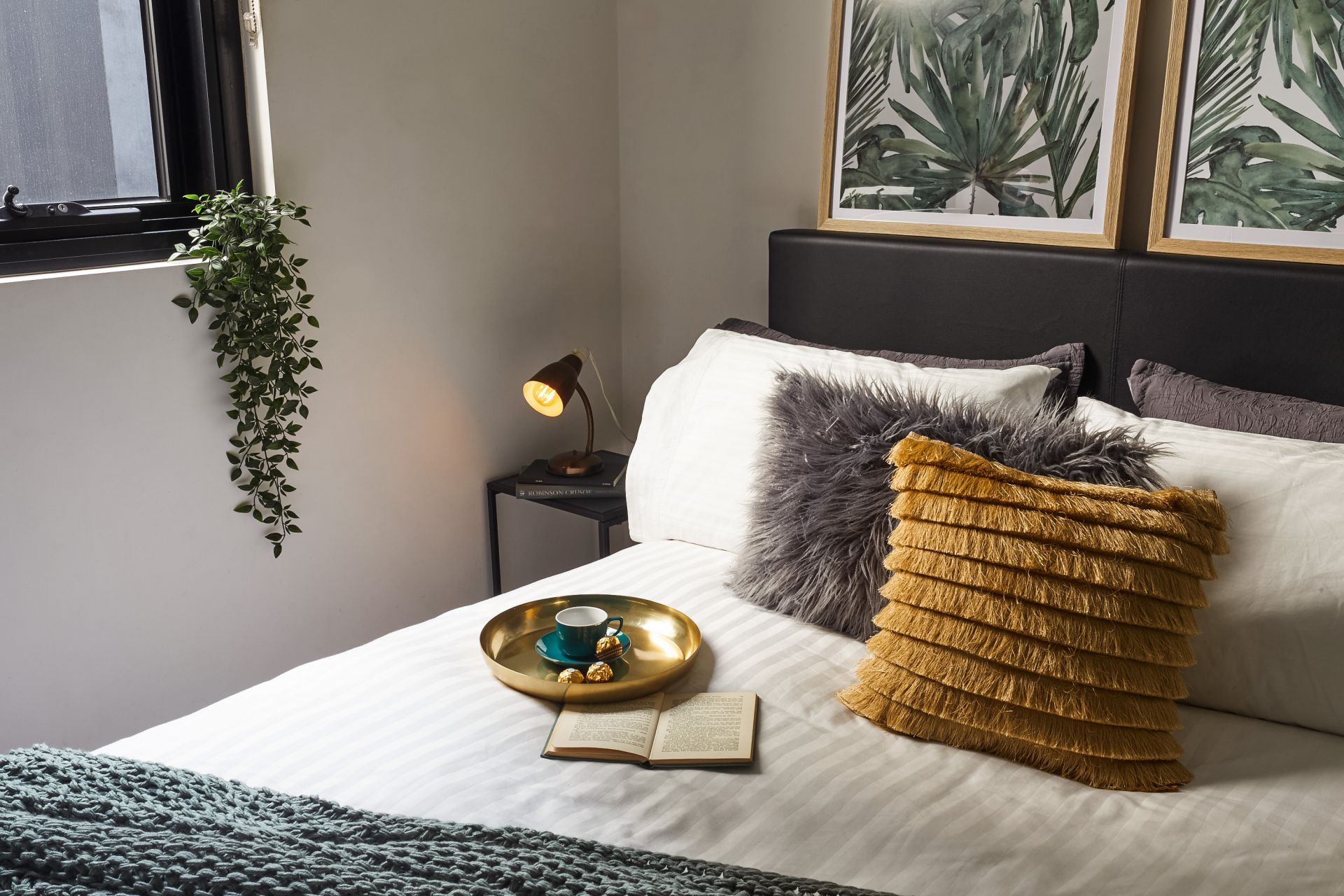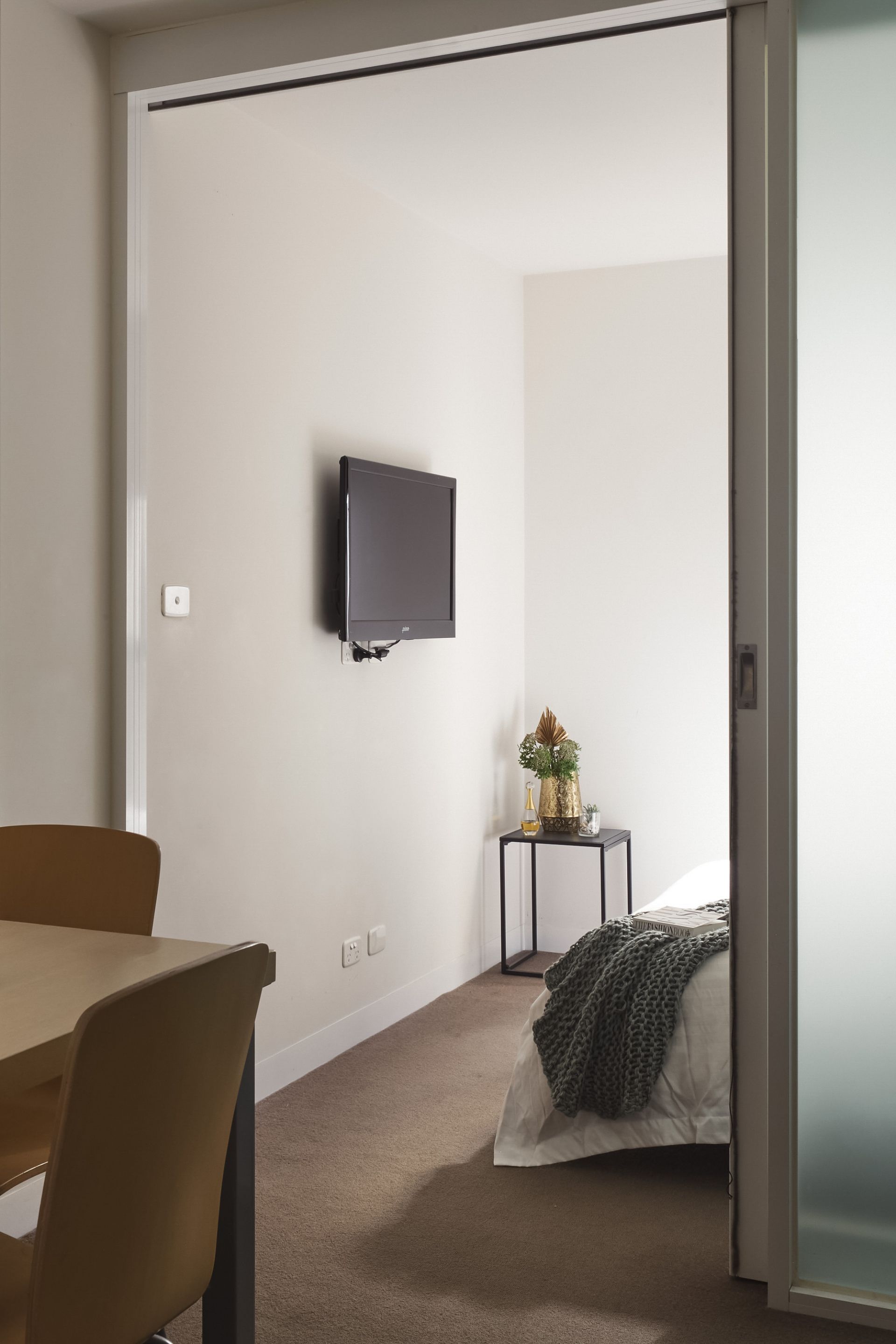 This modern studio-style, fully furnished apartment in North Melbourne’s premier and popular precinct is located on Level 4. It includes a bedroom and open plan dining and study area, linen cupboard, a kitchen with plenty of cupboard space and a separate bathroom. Other special features include, secure entry to the foyer and lift to the apartment, reception area, open welcome lounge with a large smart TV, undercover bicycle racks and external courtyard, onsite laundry with washing machines and dryers, plus two lounges with floor to ceiling windows with views and large TV screens, as well as a large outdoor terrace area on the 6th floor with BBQ facilities, seating and views across North Melbourne.