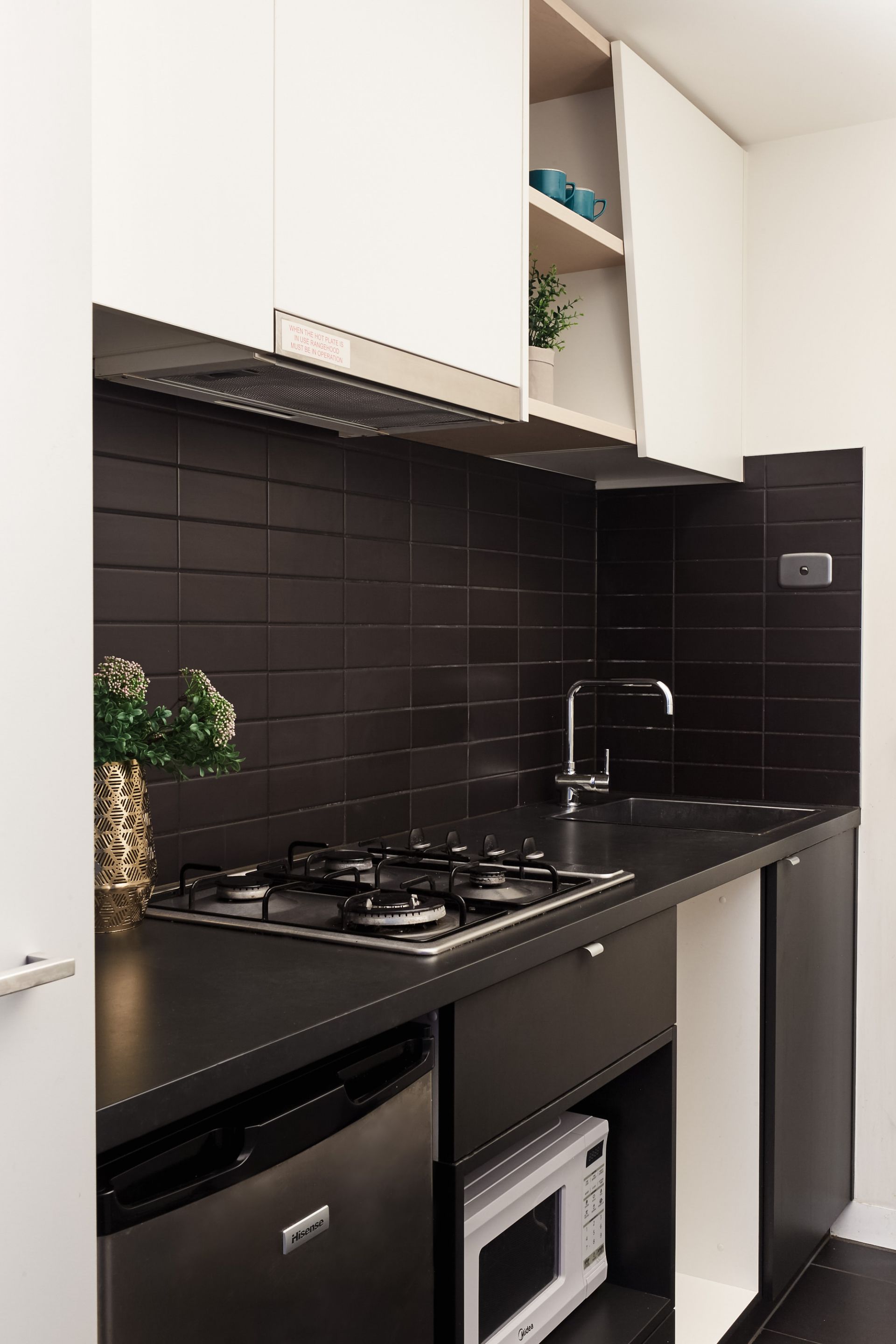 The kitchen includes gas cooking hotplates, fridge, pull-out pantry, and microwave along with plenty of storage. There is a living area that includes dining and a study area. The bedroom is separated by a sliding frosted glass door, while the ensuite bathroom features a toilet, shower, a wash basin, a full wall mirror, and shelves for convenient storage. Public transport by bus or tram are at the doorstep.