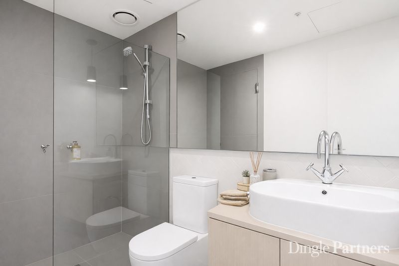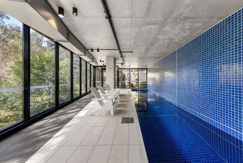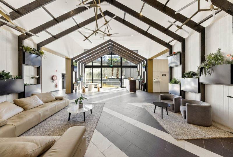 Be welcomed home by a grand hotel-style foyer with soaring ceilings, contemporary lighting and lush greenery. Inside, this stylish apartment features a blend of natural textures and modern finishes, including smoked timber flooring and designer black accents.