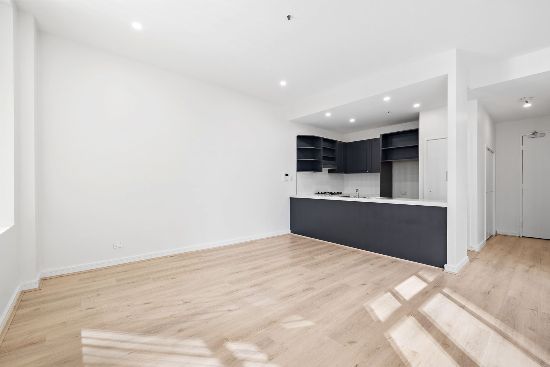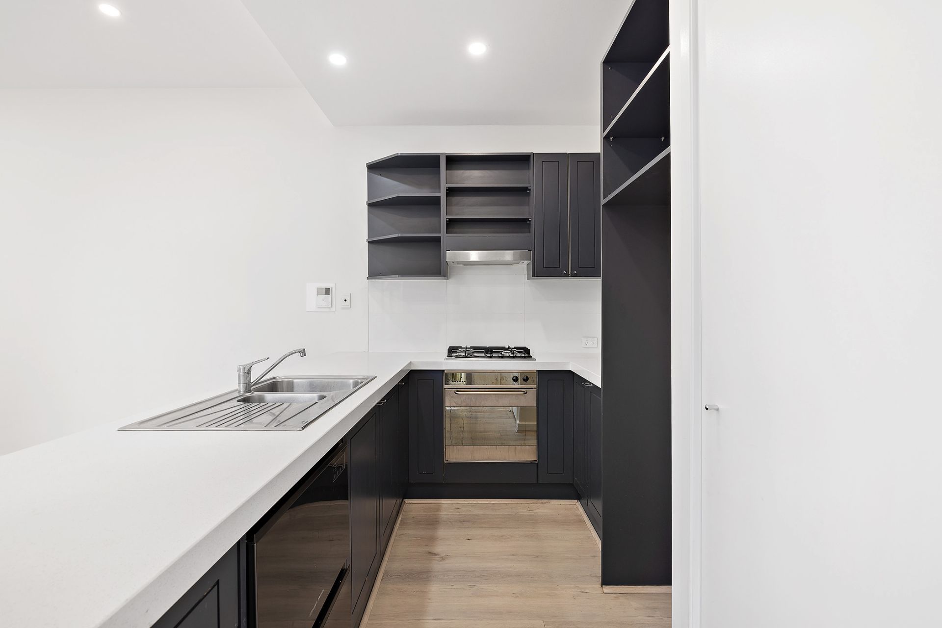 Modern kitchen with stone benching, DW & pantry adjoins living area .
