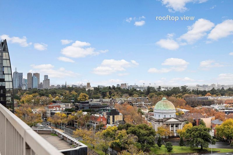 Residents enjoy access to premium amenities, including a rooftop terrace with sweeping panoramic views across Albert Park and the city skyline, as well as a fully equipped, modern rooftop gym.